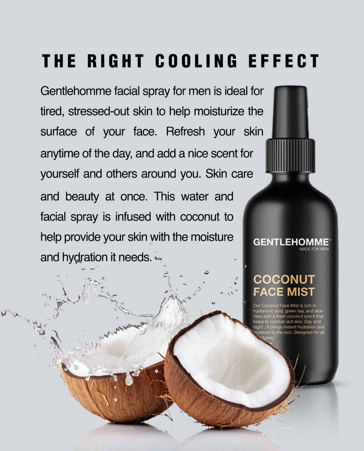 Gentlehomme Coconut Face Mist for Men has hyaluronic acid, aloe vera, & green tea that moisturizes, hydrates, and soothes your facial skin. Add to cart now!